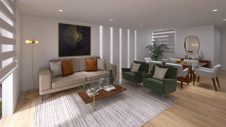 La sala, con su sofá suave y los sillones verdes, evoca un susurro de elegancia. La luz que se filtra entre las lamas crea un juego de sombras, como si el espacio respirara. Cada objeto cuenta una historia, cada rincón, una promesa de calidez.