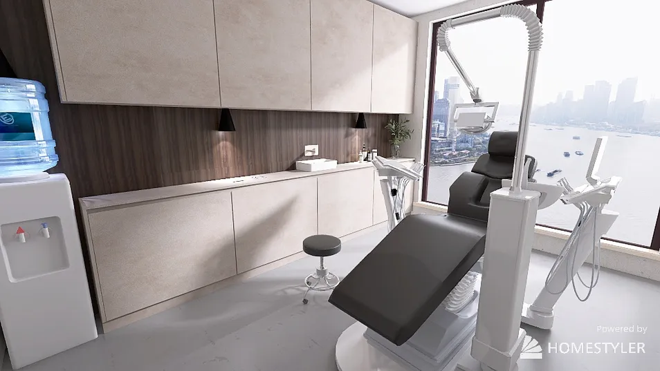 This is a doctor's office in a minimalist style with industrial touches -1 desk area -1 office