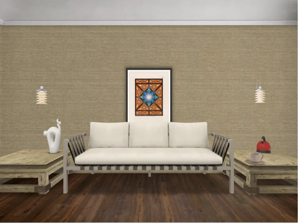 An homage to the TV series Twin Peaks, but instead of red curtains and checkered floor....we have a kind of an earthy-toned room complete with modern sofa and a tea kettle ^_^ (Eeffoc emos ekil dluow)