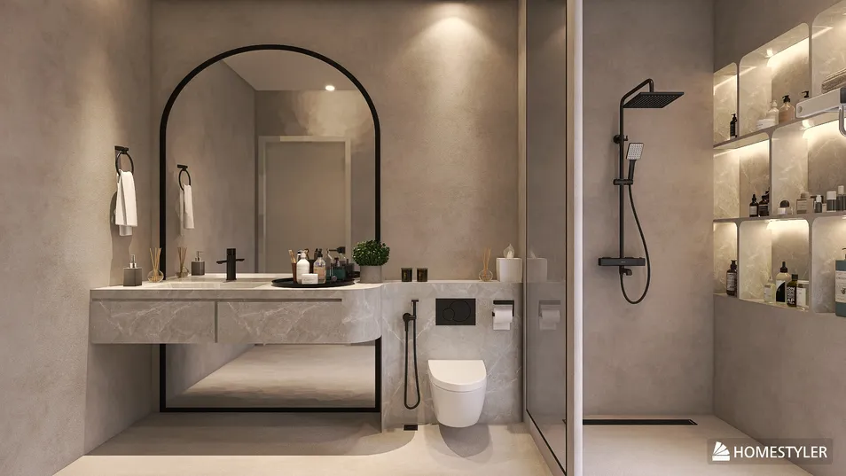 In this serene bathroom design, the gentle curves of the vanity and the clean lines of the fixtures create a harmonious balance. Subtle textures and a muted palette invite relaxation, making it a perfect retreat for rejuvenation.