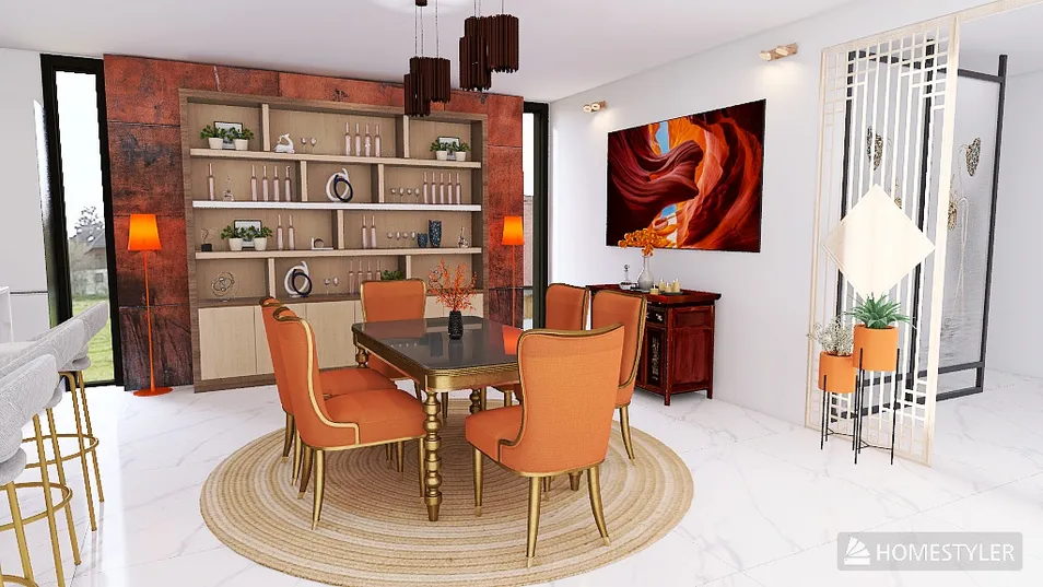 Comedor con ventanas laterales y toques de naranja en muebles y decoraciones.