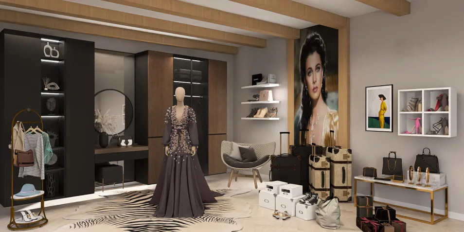 Neste ambiente, cada detalhe revela uma elegância sutil. A luz suave destaca as texturas luxuosas e as roupas cuidadosamente dispostas, enquanto o mural instiga memórias de glamour. Um reflexo do que somos e do que aspiramos ser, em cada peça exposta.