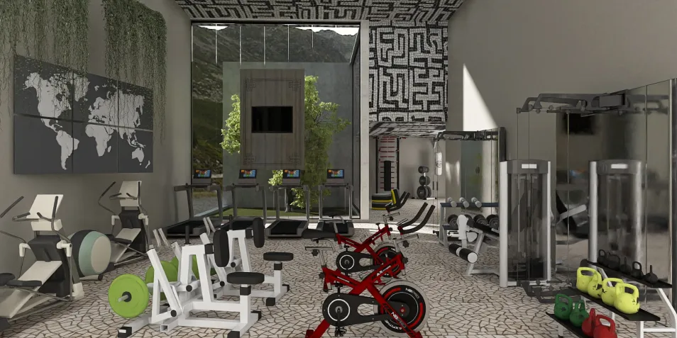 Neste ambiente, a fusão de elementos minimalistas e tecnológicos se destaca. Máquinas de musculação se alinham com a natureza, enquanto um mural intrincado desafia a percepção. Aqui, o suor encontra a serenidade, e a busca pela forma ideal se torna um ritual quase poético.