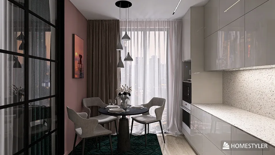A stylish apartment for a family of three, featuring two workspaces on the balconies, a shared living area, one isolated bedroom, and a sliding glass partition in the second bedroom that seamlessly blends function with elegance.