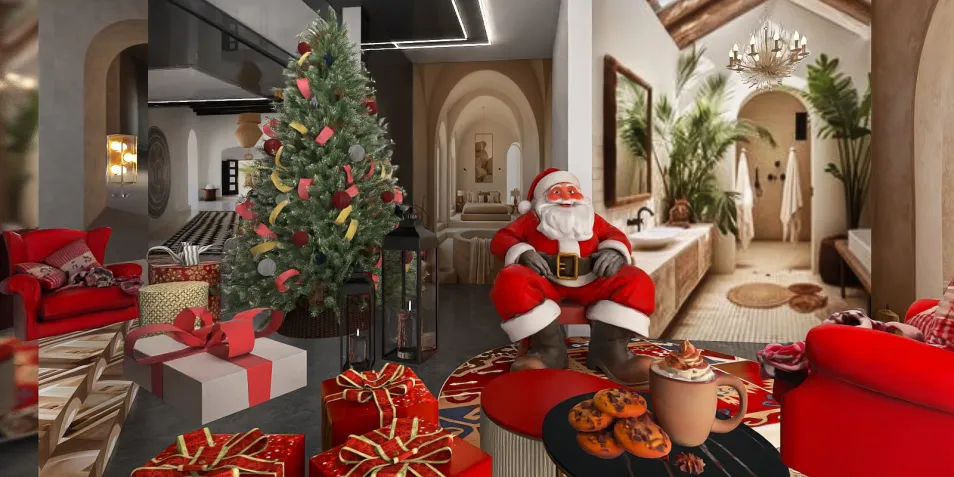 In this vibrant space, a Christmas tree stands adorned, surrounded by gifts wrapped in bright paper. The warm hues of the rug complement the cozy seating, inviting laughter and joy. It's a holiday haven, where memories are crafted amidst twinkling lights and cheerful decorations.