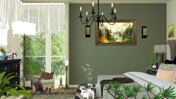 A guest bedroom with a mix of Victorian, modern, and Asian elements, in a lovely green garden setting.