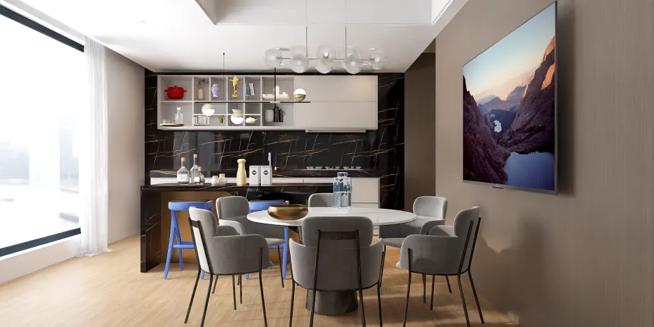 flexible and minimal, with a large central functional island and an area dedicated to the family