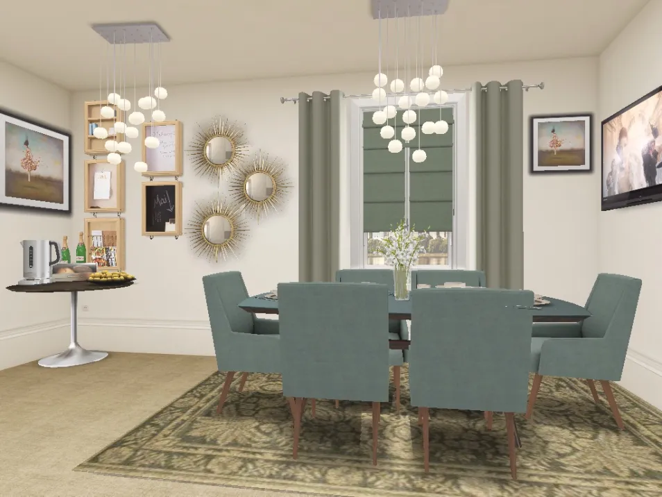 Green dining room it's look like a mordern dining room and dining room is beautiful if you put a mirror and some magazine and the other food is on the other mini table and under the table put the carpet..