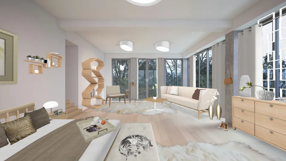 Habitación escandinava diseñada con materiales naturales como la madera, acompañados por elementos en blanco que aportan calidez y confort en toda la estancia.
