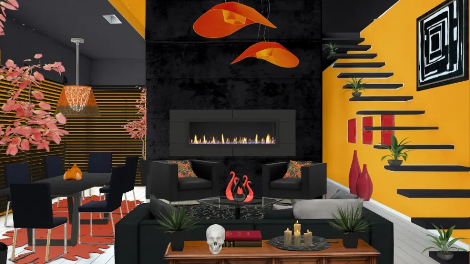 I was challenged by my homestyler friend @JazzBustos: designing something inspired by the song "Highway to hell" from ACDC. Well here it is. I confess itwas a hard challenge, cause I don't wanted to be literal (no one wants 🤣) haha. So, I tried bring the fire as the main focus of the room. Not only in the fireplace, but the walls, the ornaments and some details in orange and red. Of course, black is here! It's the dark feeling that we need to complete the inspiration 😅The skull, the red book, the candles makes it creepy enough to remind us from hell, I think I got this challenge. Haha. What do u think? Hope you like it dear Jazz 🤘🤘Развернуть