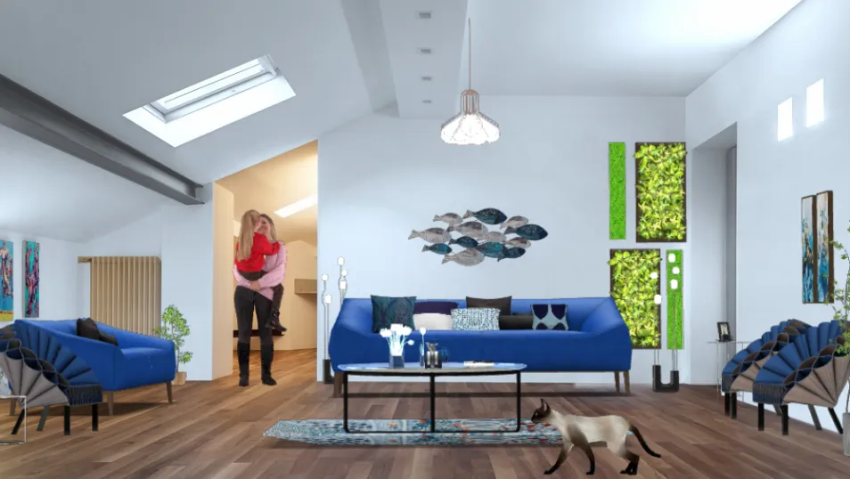 contemporary leving room using shades of blue in furniture and decorations to give a feeling of relaxing and comfort.