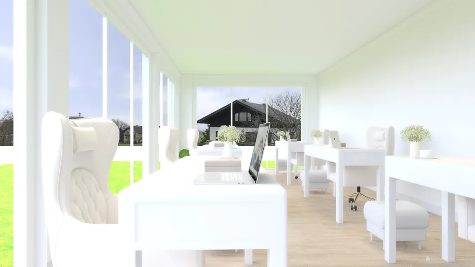 Obviously, the color palette for this office is bright white! The office is where I would want to work if I were on the homestyler team, because I love bright spaces with lots of natural lighting. The chairs are comfy, the desks are top-notch, computers cleaned, flowers beautiful, and there's even foot rests beside's each desk so if the workers want to, they can move them under their desk and rest their feet on them!