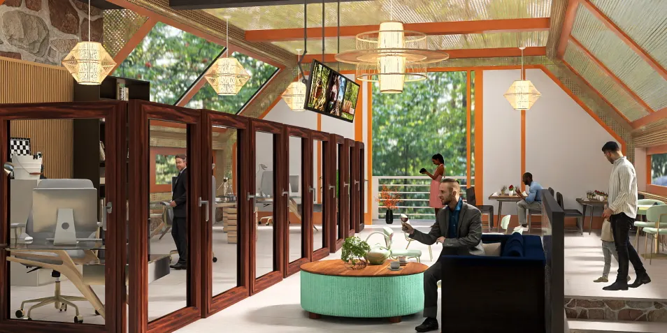 An eco friendly cabin style, peaceful and serene restaurant and office space, creating office privacy with sound proof glass doors(my imagination lolzz) while allowing a fun and lively space for dining!