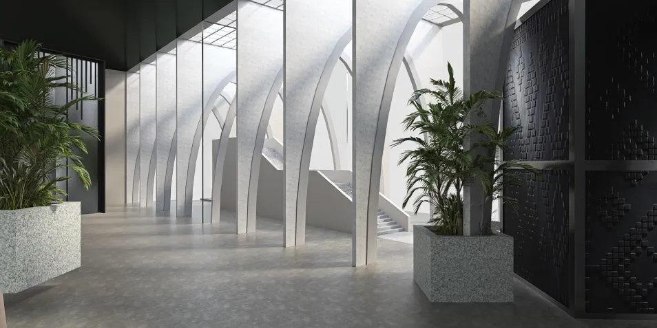 Spell April Letter I design #3 Commercial Building Ground Floor lobby escalator to elevators. Seen in downtown Manhattan before 911. Modelled after Bankers Trust Building,formerly across from WTC, NY City.