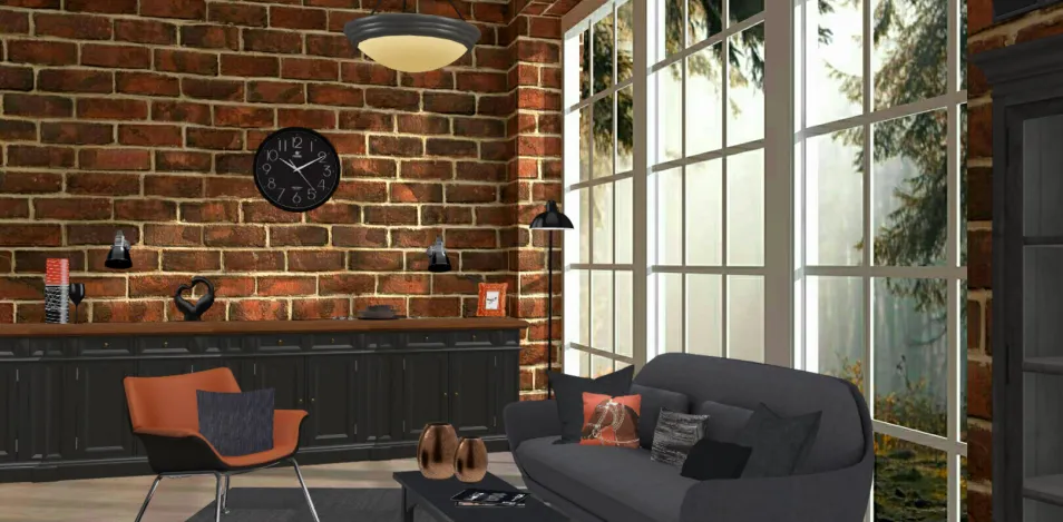 Une salon au style industriel avec des ton orangé, gris et noir, parfait pour un loft à New York ou une soirée entre potes!