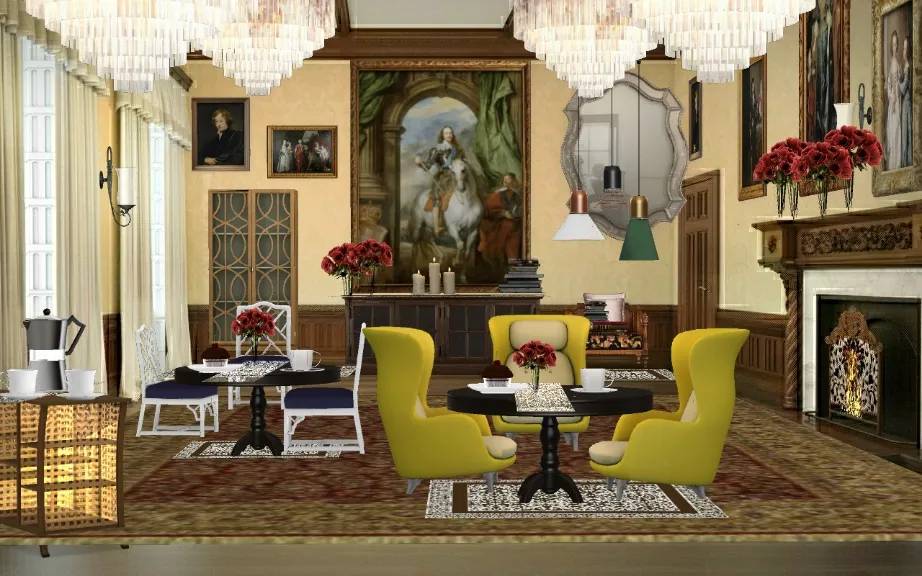 of photographs taken in the Beast's Dining at Disney World, a credit to my daughter, Ally. The blue dining chairs represents the blue outfit the Beast wore in the movie, the yellow dining chairs, Belle's gorgeous yellow dress. There is a chair in the back right corner for her to read with lots of books to read and over the chair are a set of bell lights. The wardrobe in left corner, Madame Gardenrobe, the melted candles, Lumiere, the coffee pot, Mrs. Potts, tea cups, Chip, and of the roses, represent that one special enchant rose.