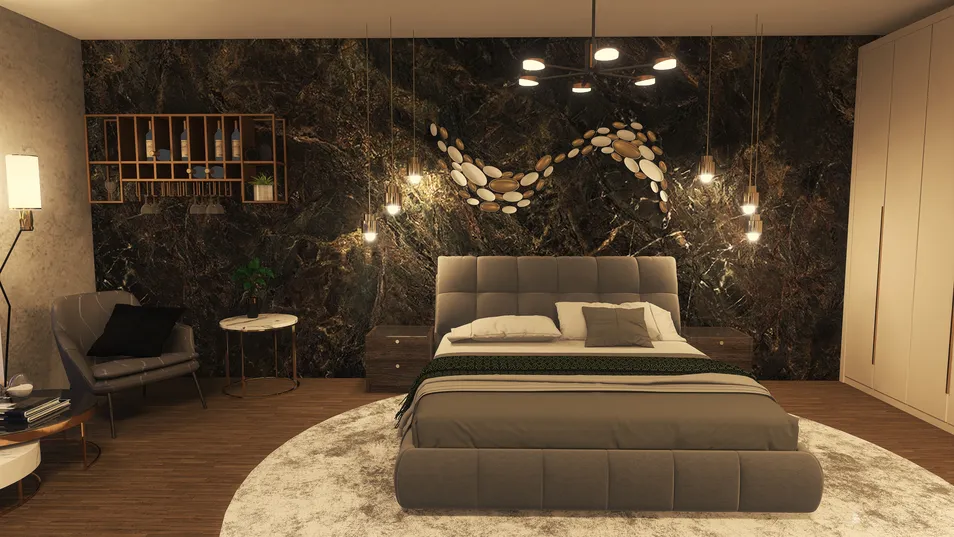 The objective was to create an imposing room, which is achieved thanks to the apparent materials and the simple but large furniture, the cold colors and the vegetation accompanied by natural light during the day give it freshness. , and at night the use of warm light creates a cozy atmosphere.