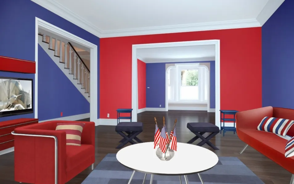 This living room uses three main colors: red white and blue. This design came to me out of nowhere because it was July 4th.