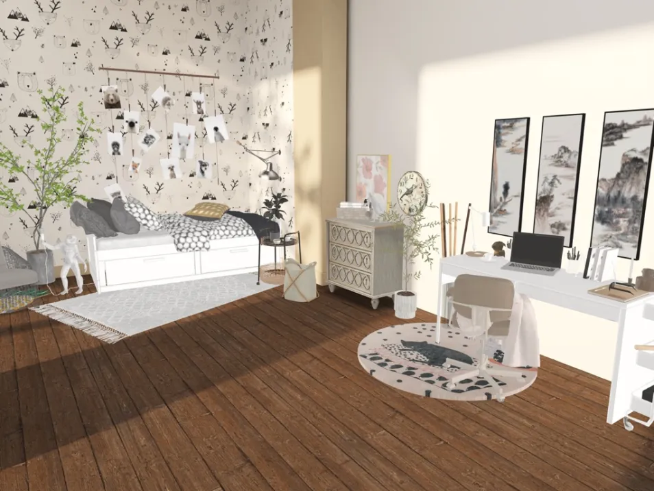 kids can have fun , do homework sleep and much more in this little kids bedroom. It is bright colourful but also full of storage.