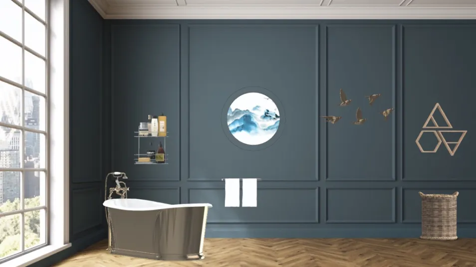 L’eau et le bleu vont dans cette salle sans rancune ! Qui peut rêver mieux ? Un joli tableau nous rappelle notre enfance à la mer et des oiseaux virevoltent autour d’un baignoire en or !