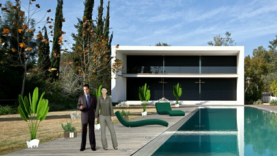 i signori mostrano la propria casa con la piscina e le piante disposte in maniera alternata
