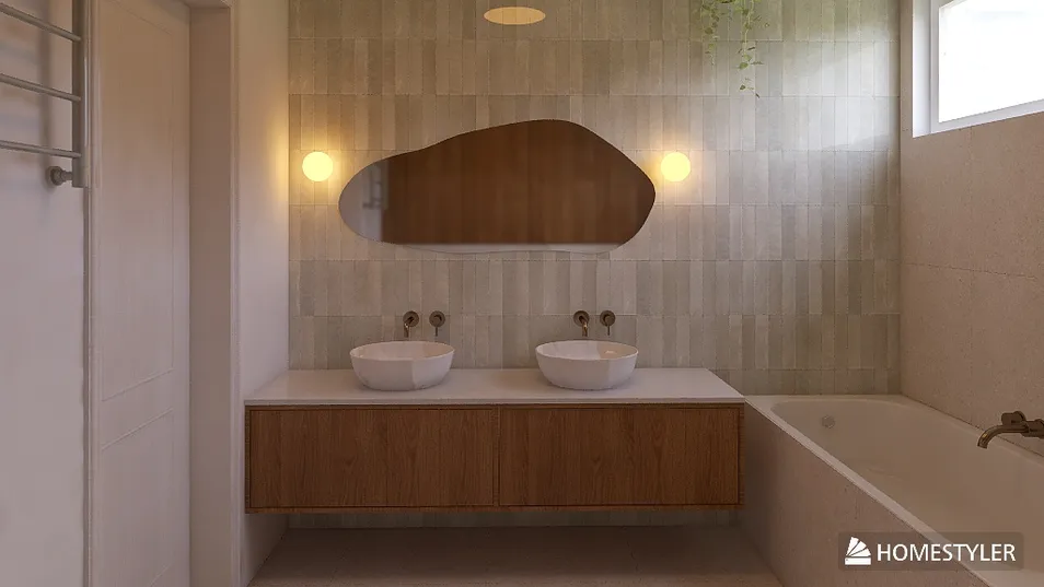 W minimalistycznej przestrzeni łazienki, gdzie drewno spotyka delikatne światło, każdy element jest przemyślany. Okrągłe lustro wprowadza harmonię, a rośliny dodają życia. Z pozoru chłodne płytki skrywają ciepło, które można dostrzec tylko w intymnych chwilach.