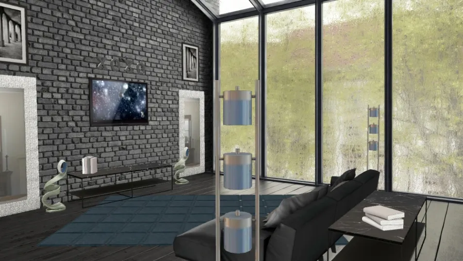 A monochromatic living space with dark tones and blue accents.