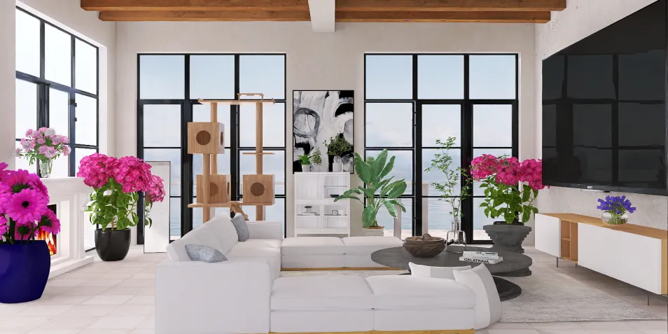 I would say that this is a seperate living room and not open. It could be an open living room but it would be small. This also has a cat tree and lots of plants.