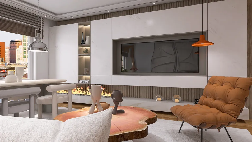 The decoration project for the living-dining room features a decorative fireplace and large television as central elements, set against a background of neutral tones that create a calm and welcoming atmosphere. Accents of a vibrant cauldron orange are strategically incorporated, adding warmth and a touch of energy to the space.The design shows a careful mix of Bauhaus-style pieces, which bring a sense of modernity, along with Japanese-inspired elements that contribute to the serenity of the environment. The clean lines and functional shapes of Bauhaus furniture harmonize perfectly with the simplicity and elegance of Japanese design, creating a balanced aesthetic.This combination not only enhances the visual appeal of the room, but also fosters a tranquil atmosphere, making it an ideal space for both relaxation and social gatherings. The interplay of colors, styles, and textures results in a living-dining room