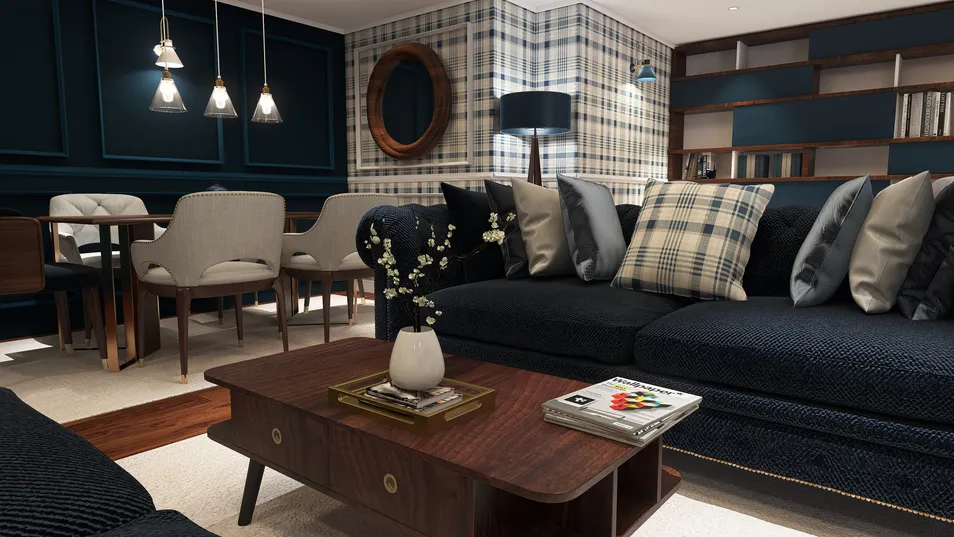 The living room of the farmhouse exudes a charming English style, characterized by its blue tones and rich, noble woods. The walls are painted in a dark blue tone, combined with Scottish wallpaper, creating a serene atmosphere that invites relaxation. A luxurious blue upholstered sofa is the centerpiece, adorned with accent pillows in various shades of blue and subtle patterns. A classic coffee table, made of polished wood, sits in the front, offering a perfect spot for afternoon tea or informal gatherings.Overall, an ideal room for shelter from cold winter afternoons.