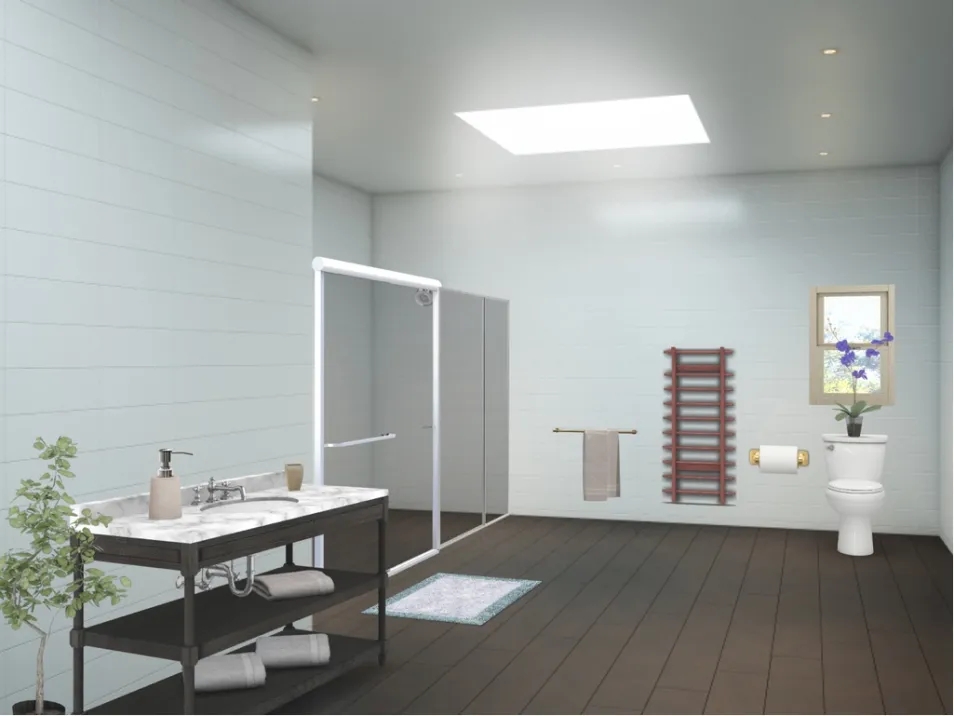 This gorgeous bathroom though having no tub is comfortable and large. The lively plants put a zest in your life.