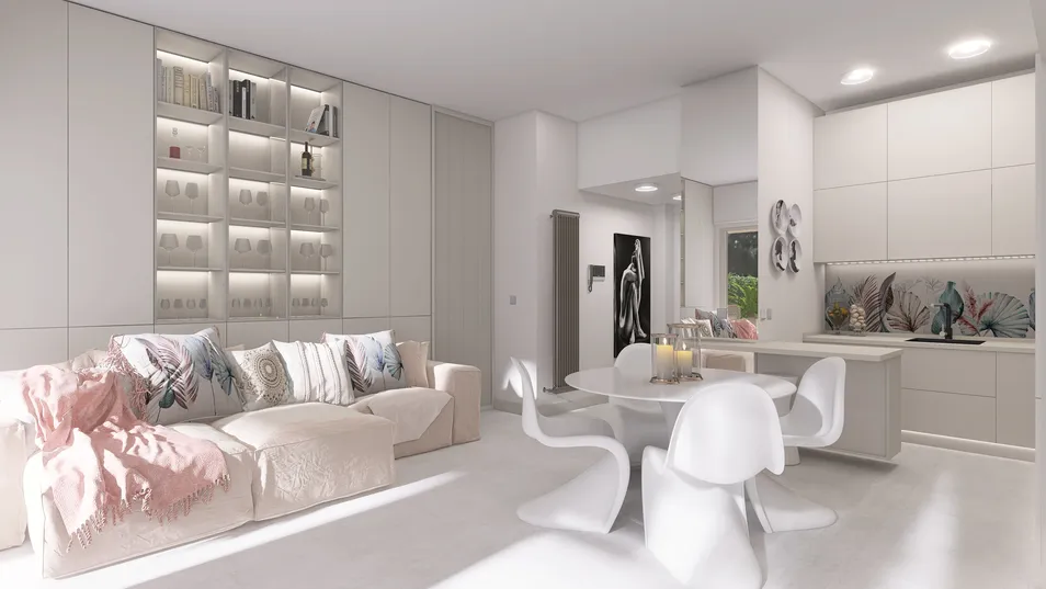 Un appartamento di piccole dimensioni trasformato in un ambiente elegante e funzionale, dove ogni dettaglio è stato studiato per offrire comfort, ordine e bellezza. Situato in un contesto urbano, questo spazio è stato ripensato per accogliere uno stile di vita contemporaneo, dinamico ma anche intimo e rilassante. Il progetto ruota attorno a una palette chiara e neutra, dominata dal bianco caldo, da toni sabbia e beige cipriati, che amplificano la luce naturale e rendono ogni ambiente arioso e accogliente. Il soggiorno, pur compatto, ospita una parete attrezzata retroilluminata che funge da elemento scenografico e funzionale, accanto a un divano morbido dalle proporzioni generose. Il tavolo rotondo crea una zona pranzo fluida, leggera, perfettamente integrata nel living. La cucina, completamente bianca e su misura, è arricchita da un backsplash grafico e decorativo che rompe la monocromia con un accento botanico sofisticato. L’illuminazione è studiata con grande cura: lampade circolari a soffitto e luci integrate valorizzano superfici e oggetti, restituendo un’atmosfera elegante e contemporanea anche nelle ore serali. Il corridoio si apre con leggerezza verso la zona notte, dove una carta da parati artistica accompagna la testata del letto, creando un fondale scenico e poetico, perfetto per il riposo. Gli spazi di contenimento sono ben distribuiti, spesso integrati nelle pareti o mimetizzati da volumi chiari e minimali. Una nicchia vetrata retroilluminata ospita una collezione di bicchieri e bottiglie. Lo studio, raccolto e ordinato, segue la stessa linea estetica: tavolo rotondo, pareti bianche, arredi sospesi e pochi oggetti curati. Ogni zona della casa parla la stessa lingua: essenzialità, coerenza, comfort visivo. Un progetto che dimostra come anche in pochi metri quadri si possa costruire un rifugio completo, sartoriale e contemporaneo, in cui la luce, i materiali e la proporzione degli spazi dialogano armoniosamente con lo stile di vita di chi lo abita.