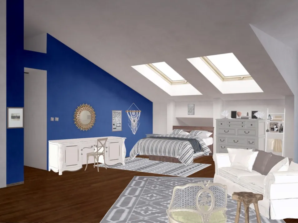 This is a Mediterranean bedroom that can also double as a sitting area. The bed has its own nook, and the dresser and ladder shelves are in a nook right next to it. There is a sitting area with an armchair and a comfy couch, and also a dressing table that can double as a desk.