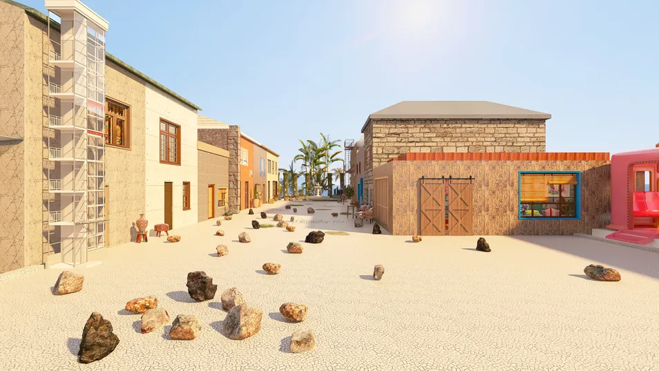 Un'assolata strada di un paese messicano, colorata e allegra, edifici moderni e vecchi che si mescolano. Piante, sedie fuori dalla porte, tutto molto pittoresco.