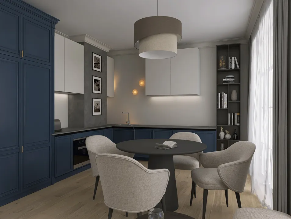 In a seamless blend of function and elegance, this minimalist dining living room invites tranquility. Soft hues and sleek furnishings create a serene atmosphere, where every piece speaks of purposeful design, making it a perfect retreat for both intimate dinners and quiet moments.