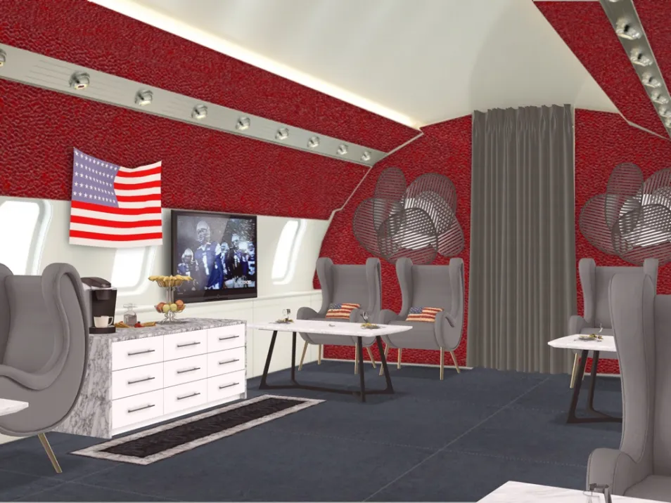 Modern Air Force one has a coffee bar, flat screen interactive tv, seating for President and First Lady as well as Staff.