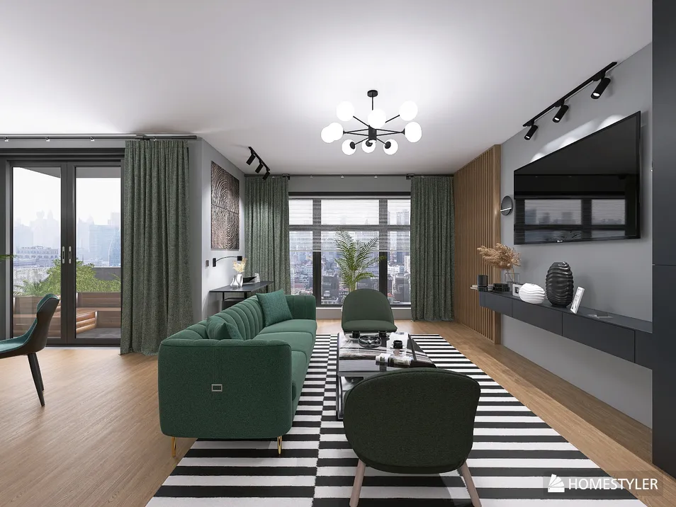 In this modern apartment, a sophisticated grey and black palette sets the stage for a sleek and stylish interior. Dark green accents breathe life into the space, creating a striking contrast against the muted tones. Plush furnishings and geometric decor pieces are thoughtfully arranged to enhance both comfort and aesthetic appeal. Large windows allow natural light to flood in, illuminating the exquisite textures and clean lines throughout the rooms, while potted plants add an organic touch to the urban atmosphere.