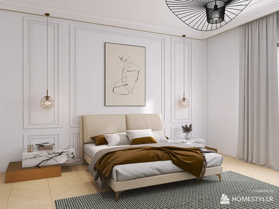 A contemporary design solution for a small bedroom using neutral colors and rust as an accent color.
