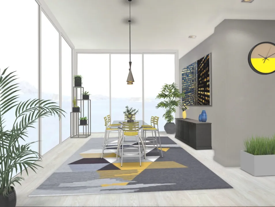 Nice, modern dining room with hints of yellow and green in the all grey room with lots of natural light!