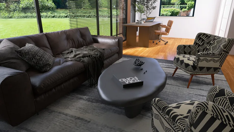 This living space seamlessly blends comfort and style. The rich, dark leather sofa invites relaxation, while geometric patterned chairs add a touch of contemporary flair. A sleek coffee table anchors the room, creating a harmonious balance between the inviting textures and open greenery outside.