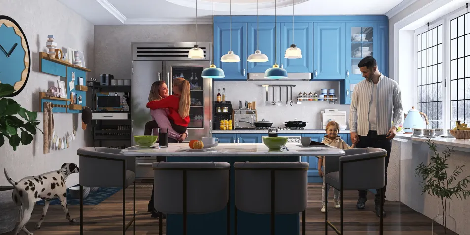 Early Monday morning, eating breakfast before school. A family of 4 and their dog in a modern blue and gray kitchen