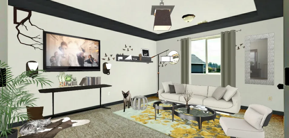 Cozy living room. And to prove it, a sleeping kitty in the corner.