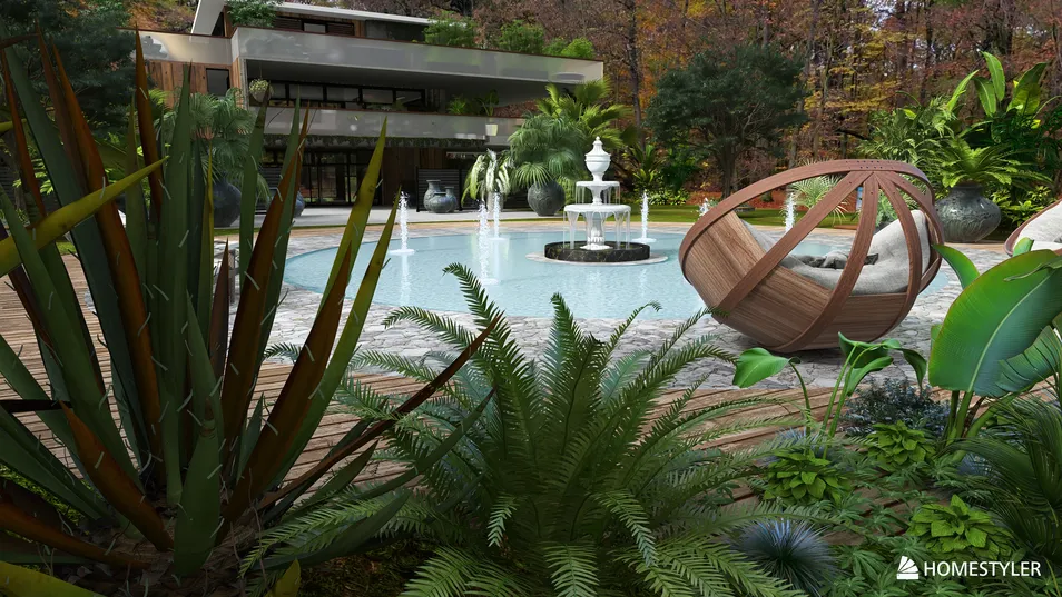 Using the multi-shape function ,I created a realaxing area with a pool and decking ..lot's of tropical plants to give a beautiful relaxing outdoor area