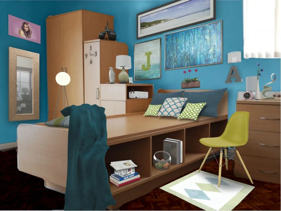 I just wanted to have fun with this one. My best friend’s favourite colour is green. Mine is blue. We just wanted to design a room that we could hang out in together during our college years.
