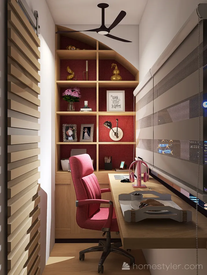 The owner was asking how to design this narrow space. The window was existing. Here are some pointers on my design suggestion (due the max character limit, the rest is after the floor plan...) --To maximize the wall, I installed a floor to ceiling shelf with ample open shelving for work related stuff like printer, or for sources of inspiration like family photos, quotes, trophies; and closed space at the bottom for more storage. --The bold wall color acts as a focal point. --I Incorporated a wall lamp for task lighting (think : ring light. LOL).