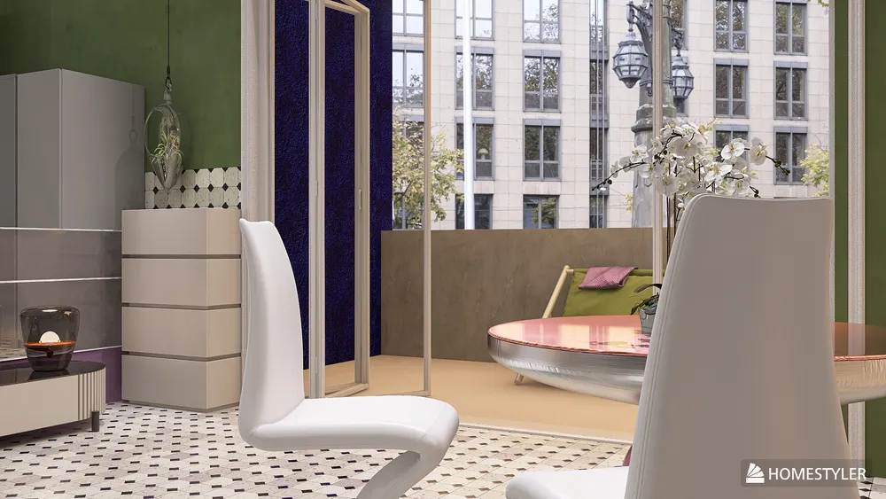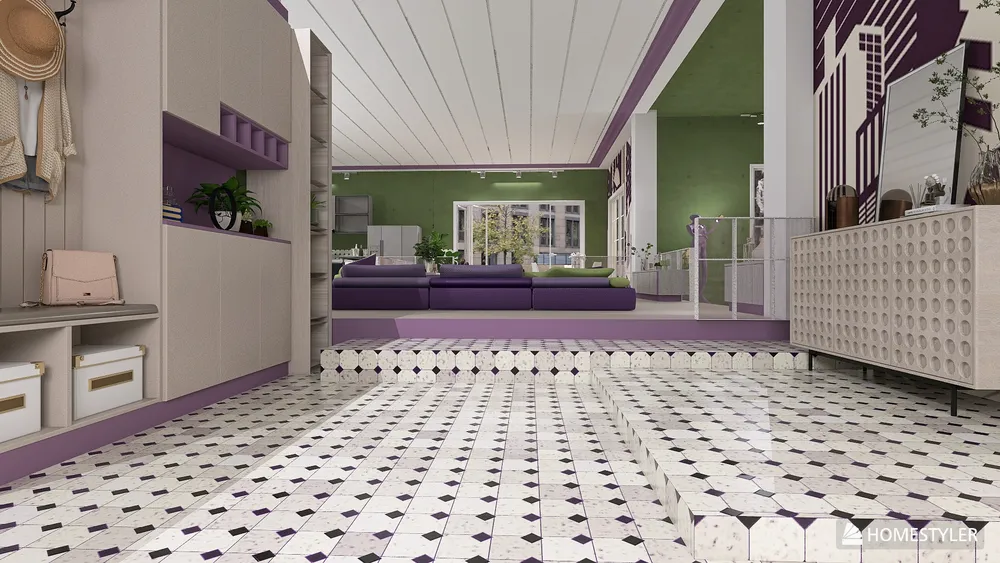 A city apartment dressed in the bold combination of green and purples. A raised central platform with seating and dining space and small open plan kitchen .... graduated steps lead down in three directions each with its own identity an entrance, a study area and another small eating space all leading in their turn to the outside balcony.