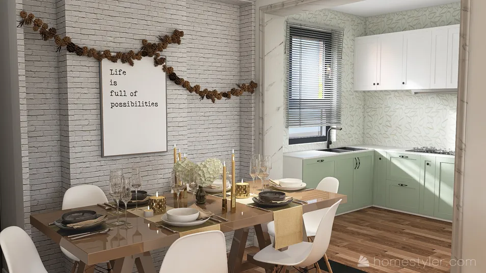 The New Year is like a fresh start so I made my design look clean, airy and new. I used peppermint greens, bare whites, and to contrast, some wooden surfaces. I also used lots of textures like bricks and logs. I really love this design so I hope that you do too.
