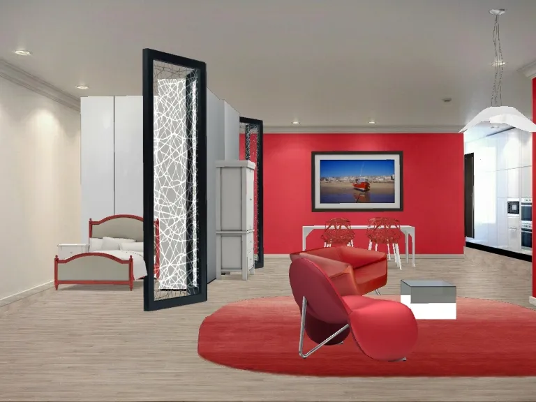 a red blushed hotel room including bathroom, kitchen, bedroom, dining room, living room and storage space provided.