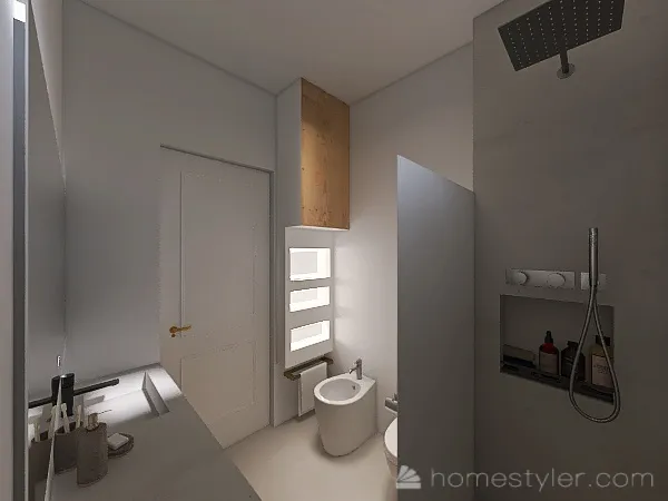 Renovation of a small seaside bathroom. Mediterranean style and natural materials, as wood and white concrete. The space is properly used, also to hide the dishwasher and the boiler.