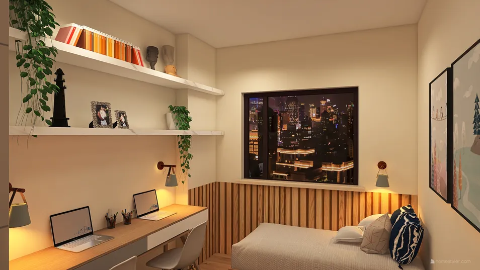 A proposta era um quarto para uma adolescente, mas que deveria ter uma bancada para duas pessoas. A paleta de cores é o mármore, madeira e tons de rosa.